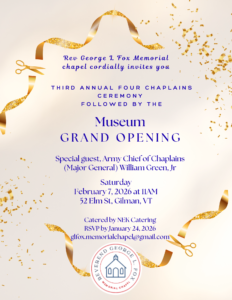 We are delighted to announce that our very special guest speaker at the 3rd Annual Four Chaplains Ceremony and Grand Opening of our musuem will be Army Chief of Chaplains (Major General) William (Bill) Green, Jr.